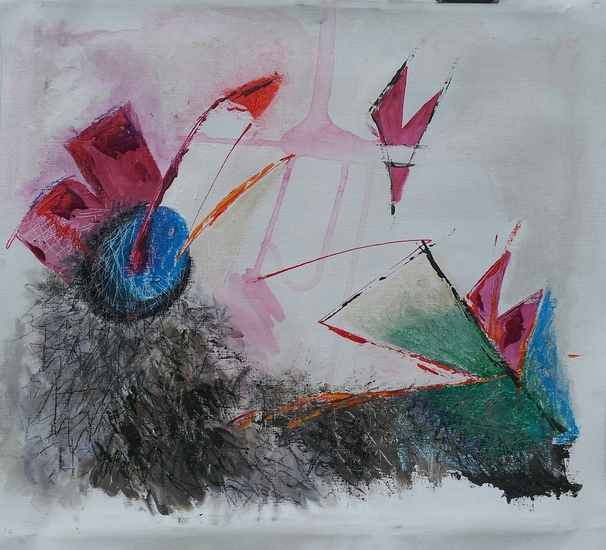 Tijdens workshop "Cobra stroming" dit schilderij "Kippig" gemaakt.